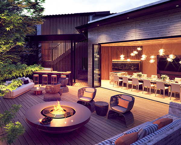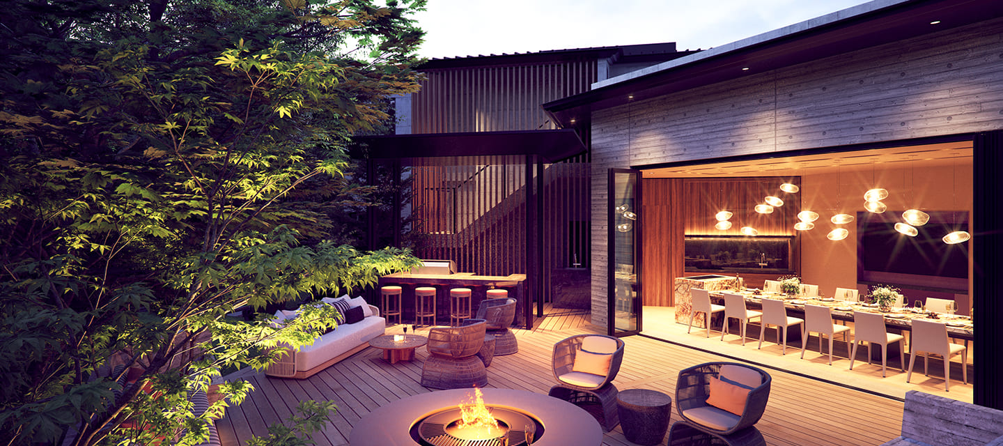 またガーデンテラスでは、軽井沢の贅沢な自然を眺めながら屋外でのバーベキューを楽しんだり、星空の下で暖炉を集いくつろぎのひと時を過ごすことができます。